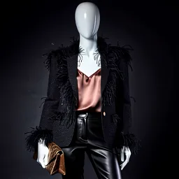 Feather Trimmed Blazer Silk Camisole Leather Pants